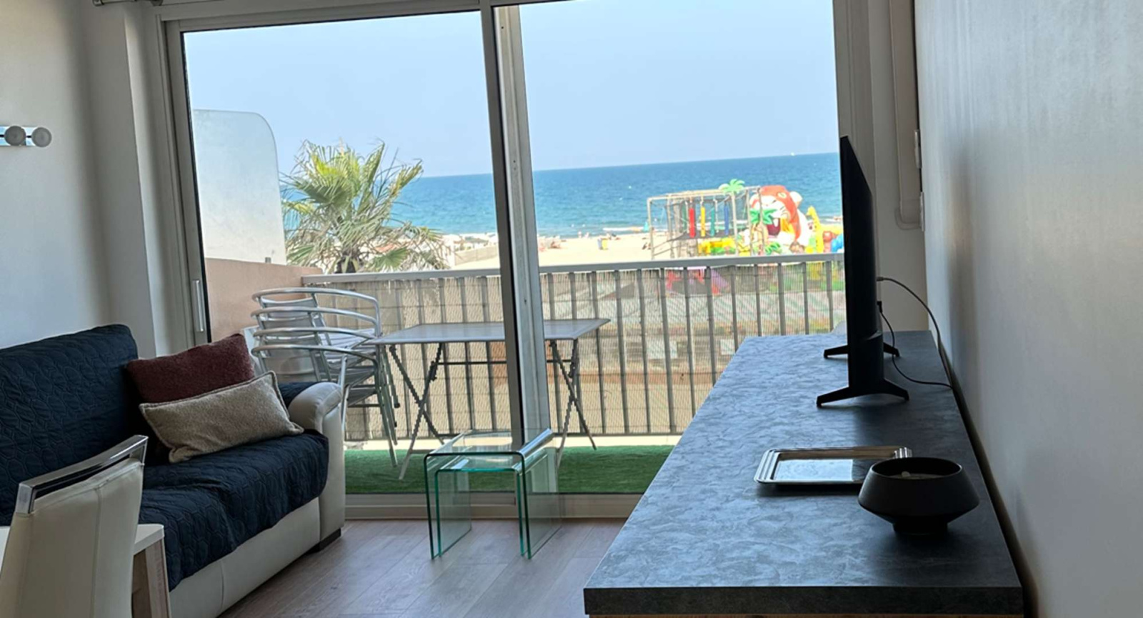 A deux pas de la Place Méditerranée, vous serez aux premières loges pour profiter des animations depuis la terrasse. Linge de maison et draps non fournis. Le ménage n'est pas inclus. Équipé pour 4 personnes.