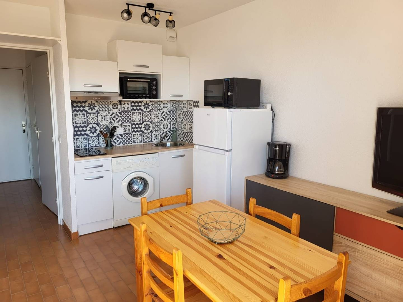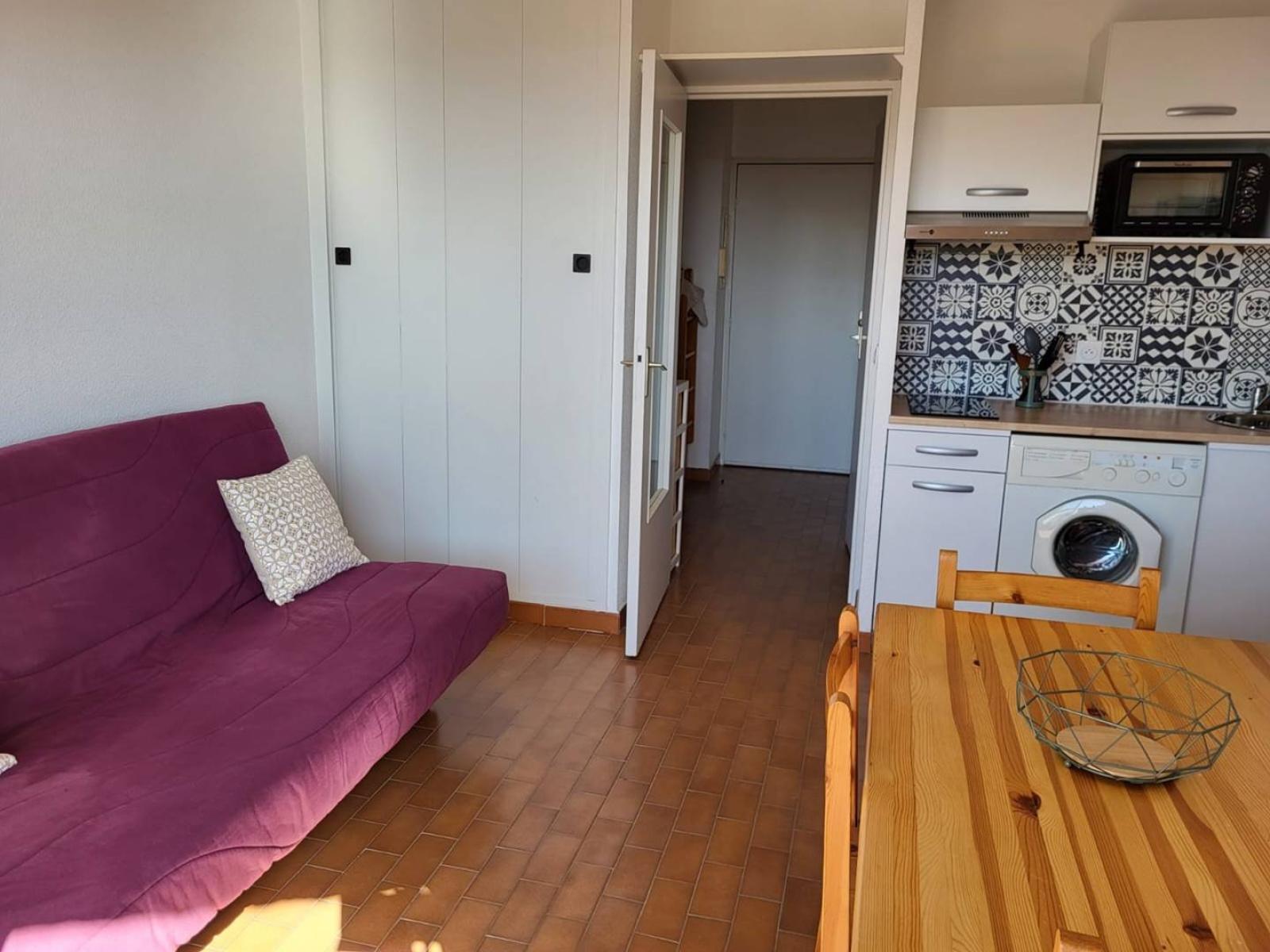Studio cabine lumineux de 22 m², situé au 5ème étage. Aménagement agréable : cuisine ouverte et équipée avec four, machine à laver, 2 plaques de cuisson induction, hotte aspirante, frigo/congélateur, micro-ondes et nécessaire vaisselle. Espace séjour avec canapé convertible, table, chaises et TV. Une salle d’eau avec baignoire. WC séparés. Une cabine avec lits gigognes. Exposé Ouest. Équipé pour 4 personnes (idéal 2 adultes/2 enfants). Suite sinistre sur copropriété les balcons ne sont pas accessible. Linge de maison et draps non fournis. Le ménage n'est pas inclus. Animaux non acceptés.