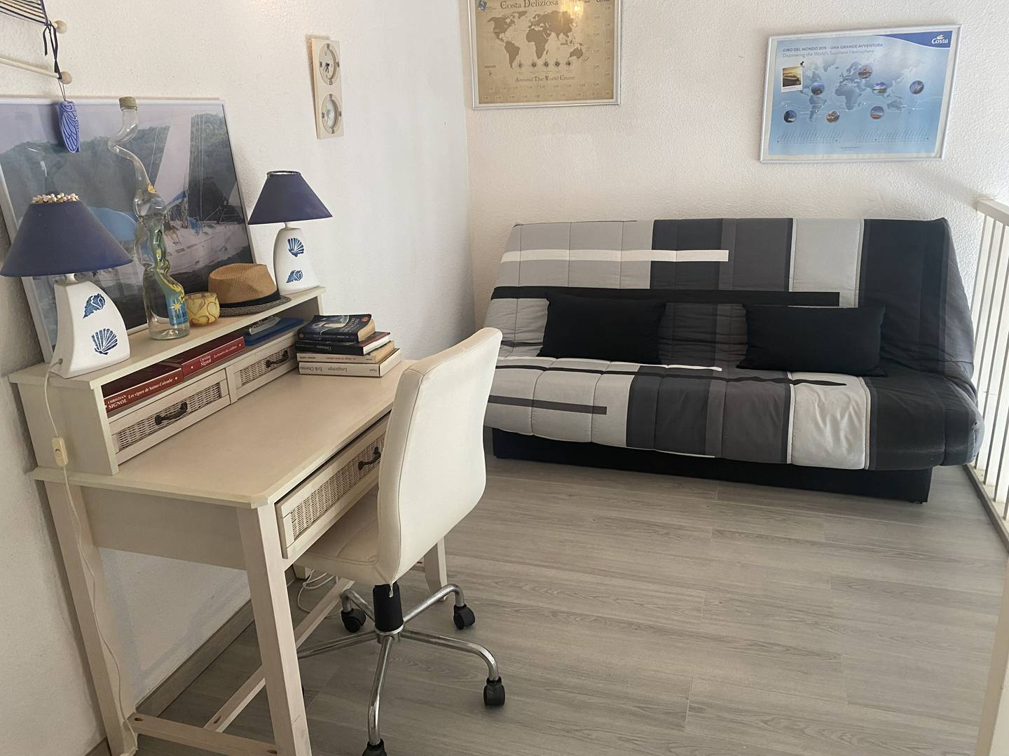 A l’étage, accessible via escalier (déconseillé enfants en bas âge) un coin mezzanine ouverte avec clic clac (couchage 2 personnes) et une chambre avec un lit en 160 (couchage 2 personnes).