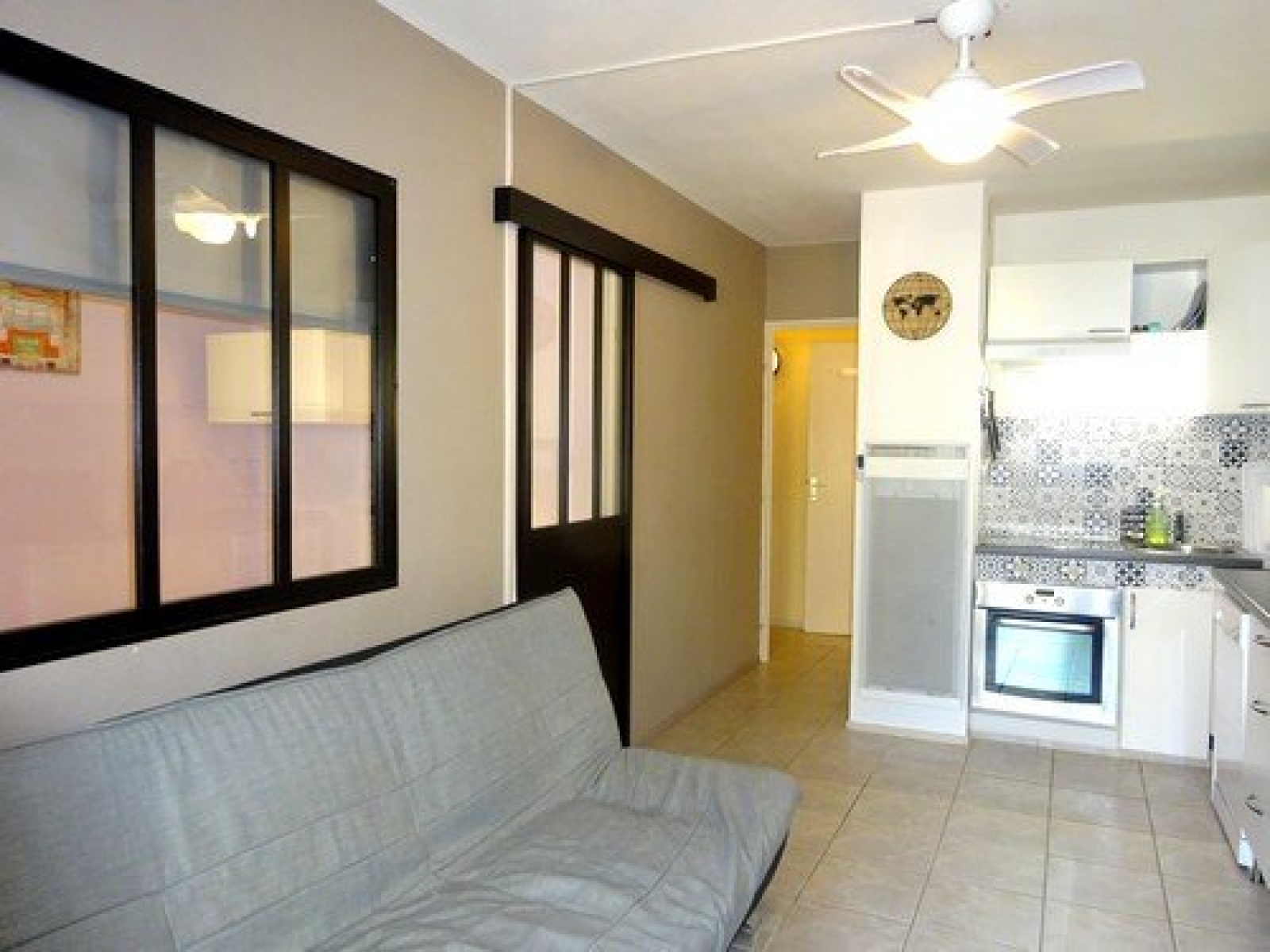 Appartement 2 pièces cabine au 1er étage (environ 42m²), composé d’une entrée, d’un coin cabine fermée avec 2 lits superposés en 90, un salon avec clic clac en 140 (couchage 2 personnes) et TV, coin cuisine sur équipée : plaques de cuisson, micro-ondes, frigo congélateur, lave-linge, lave-vaisselle et four.