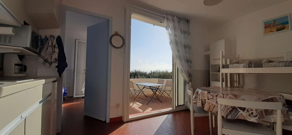 Au 3e étage: Séjour/salle à manger climatisé avec 1 couchage BZ (140 cm), TV, sortie sur la terrasse, Coin cuisine (plaques de cuisson, four micro-ondes, mini four, frigo congélateur, lave linge et lave vaisselle). Salle d'eau, wc séparés. Chambre avec 1 lit double et un lit superposé (couchage enfant). Magnifique terrasse d'angle, situation sud est, avec meuble de terrasse et une des plus belle vue mer panoramique de la Grande Plage. Équipé pour 4/5 personnes (uniquement 2 adultes et 2/3 enfants).