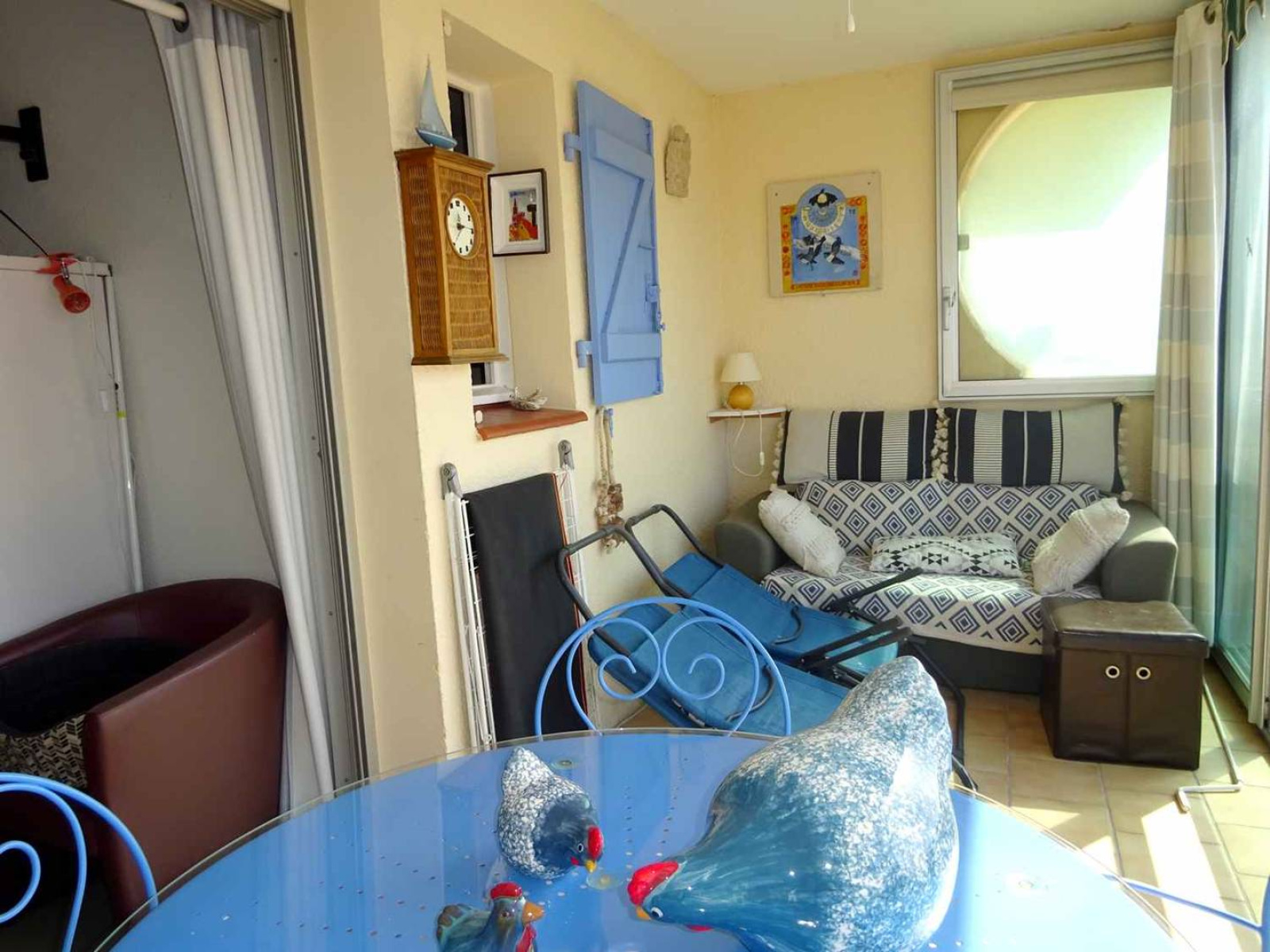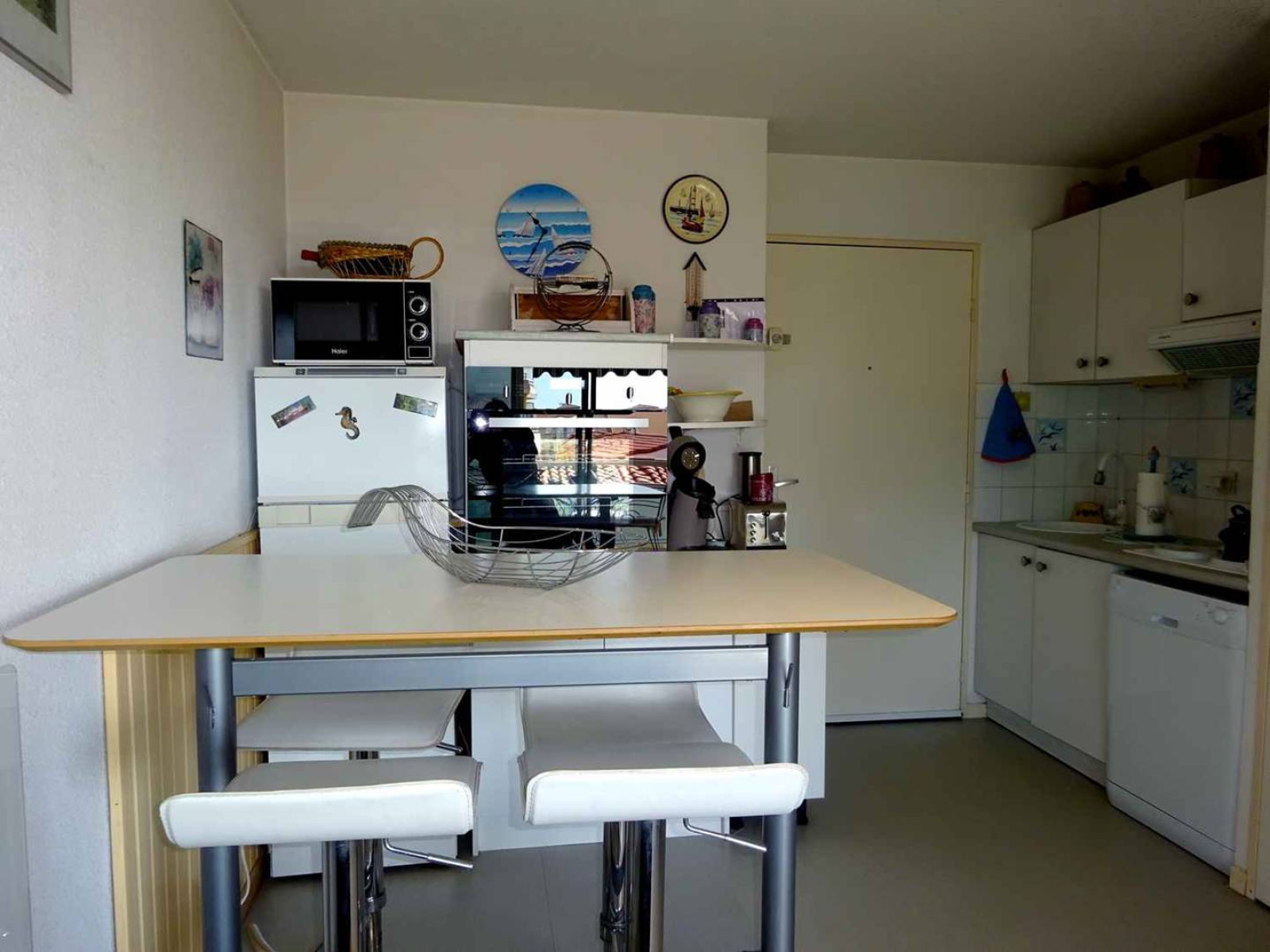 Au 2e étage: Séjour/salle à manger (climatisation) avec 1 couchage BZ (140 cm), TV, sortie sur la loggia. Coin cuisine (plaques de cuisson, four micro-ondes, mini four, frigo congélateur, lave linge et lave vaisselle). Chambre avec 1 lit double (140 cm). Salle d'eau avec WC. Magnifique loggia , situation sud est, avec meuble de terrasse et vue sur la Grande Plage. Équipé pour 4 personnes maximum .