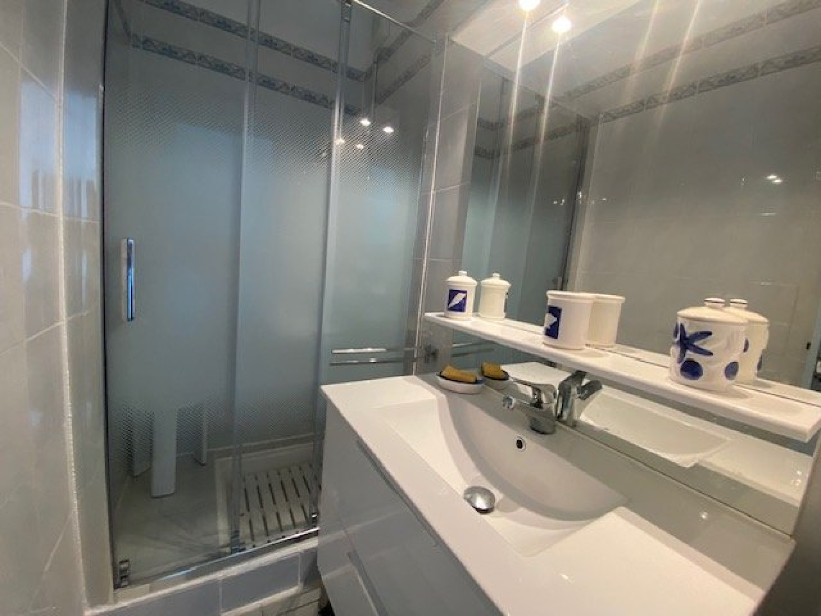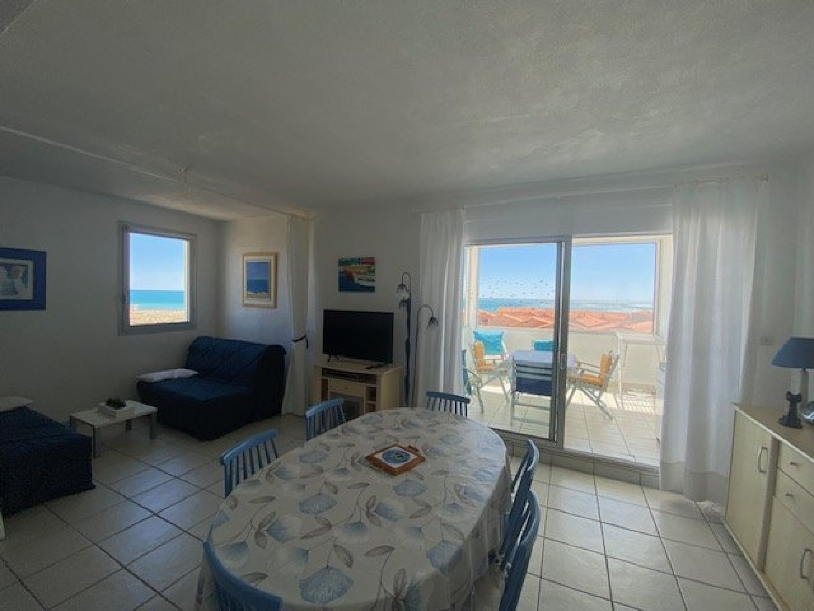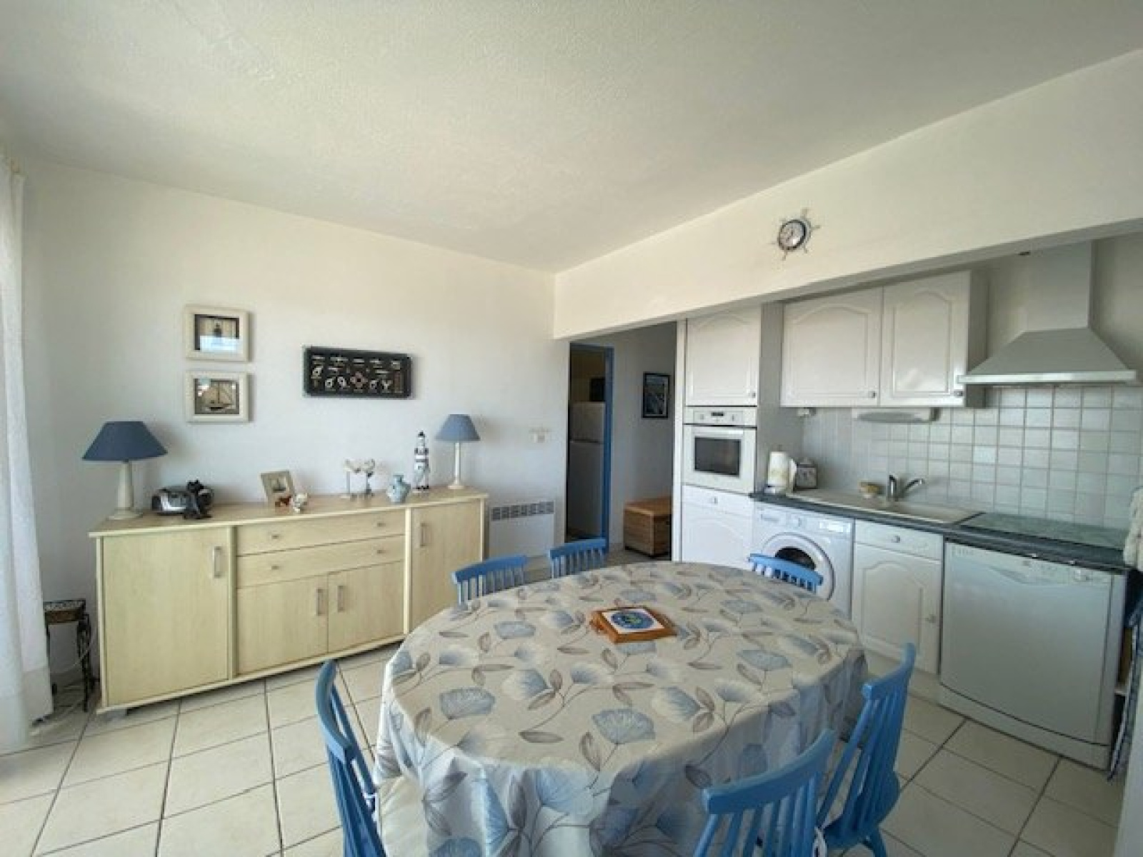 Au 3 E étage (ascenseur), Grand Appartement 2 pièces + loggia (d’environ 50m²), aménagement agréable : séjour/salle à manger avec TV et BZ (couchage 2 personnes). 1 grande chambre avec 1 lit en 140 (couchage 2 personnes) et TV. Coin cuisine équipé (plaques cuisson, micro-onde, four, frigo congélateur, lave-vaisselle, lave-linge) et cellier attenant. Une salle d’eau et WC séparé. Le séjour donne sur une belle loggia (baie vitrée) qui offre une vue mer et Paquebot le Lydia (expo EST).