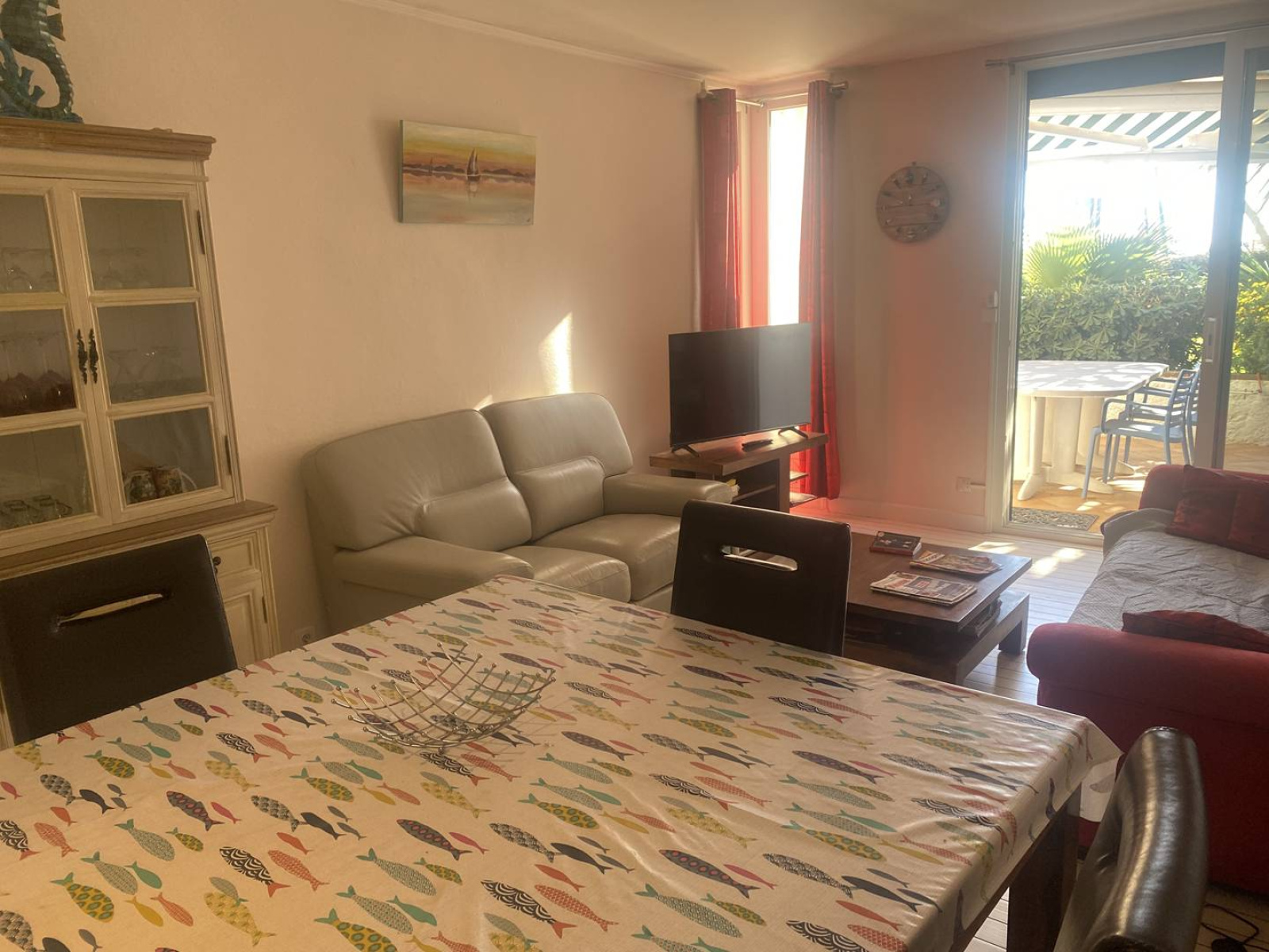 En RDC sur élevé, Bel Appartement rénové, deux pièces d’environ 49 m² confortable et agréable : Séjour/ salle à manger, coin TV avec clic clac couchages 2 personnes donnant sur terrasse (store banne) donnant sur les jardins de la Résidence, sans vis à vis. Cuisine ouverte équipée (plaque de cuisson, micro-ondes, mini four, Frigo congélateur). Une grande chambre avec un lit en 140 (couchages 2 personnes), TV et placards intégrés. Salle d’eau équipée d’un lave-linge, WC.
