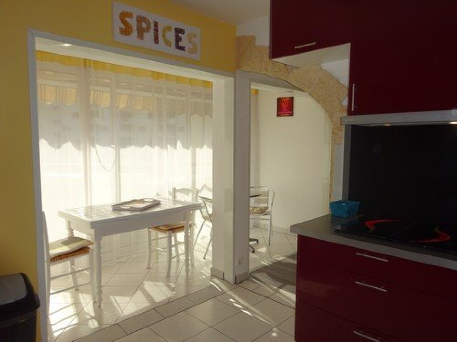 Au 3e étage avec ascenseur : Grand 3 pièces d'environ 52m² composée d'un séjour, cuisine ouverte sur équipée : micro-ondes, lave-vaisselle, cafetière, réfrigérateur/congélateur, plaques de cuisson, nécessaire vaisselle. Espace Salon avec canapé convertible en 140 avec TV.