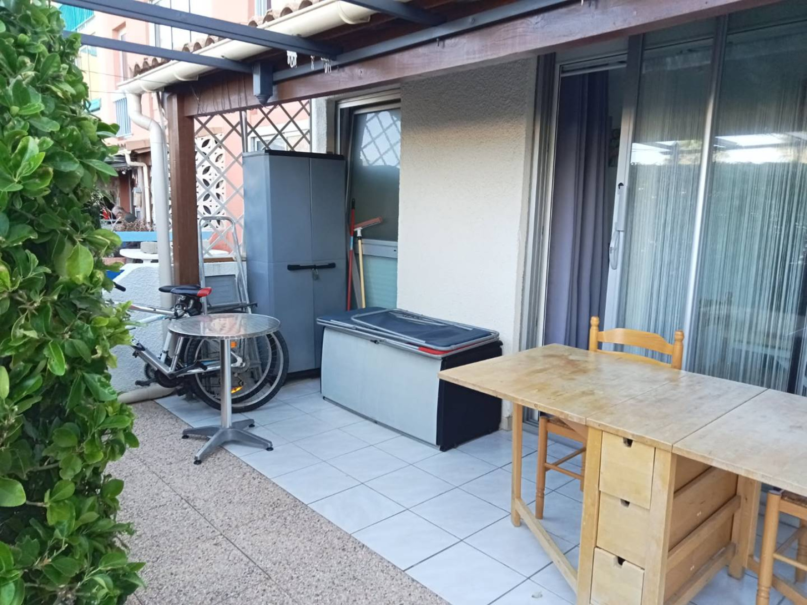 Loggia fermée (baies vitrées coulissantes) donnant sur terrasse ombragée. Coin repas et espace nuit aménagée avec lits superposés en 80 (couchage 2 enfants).