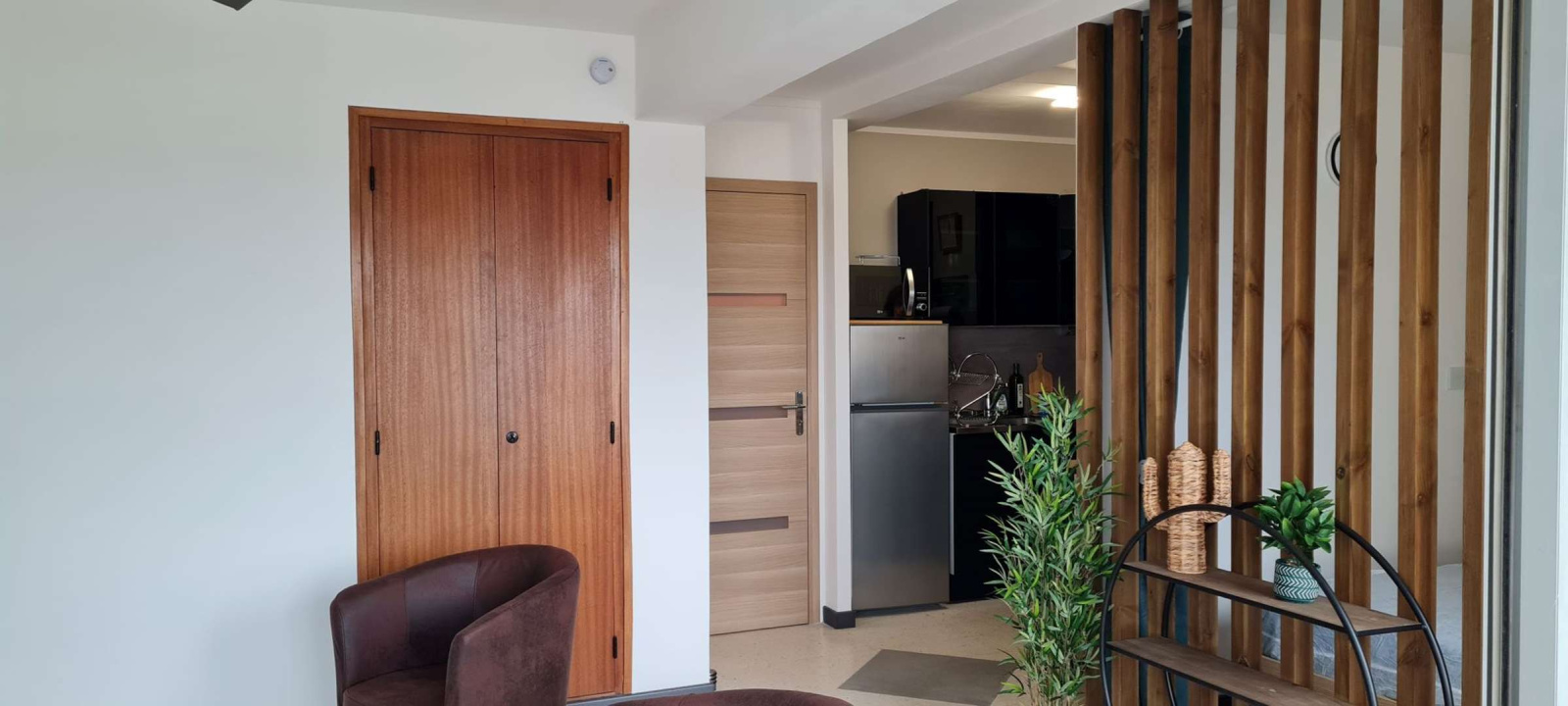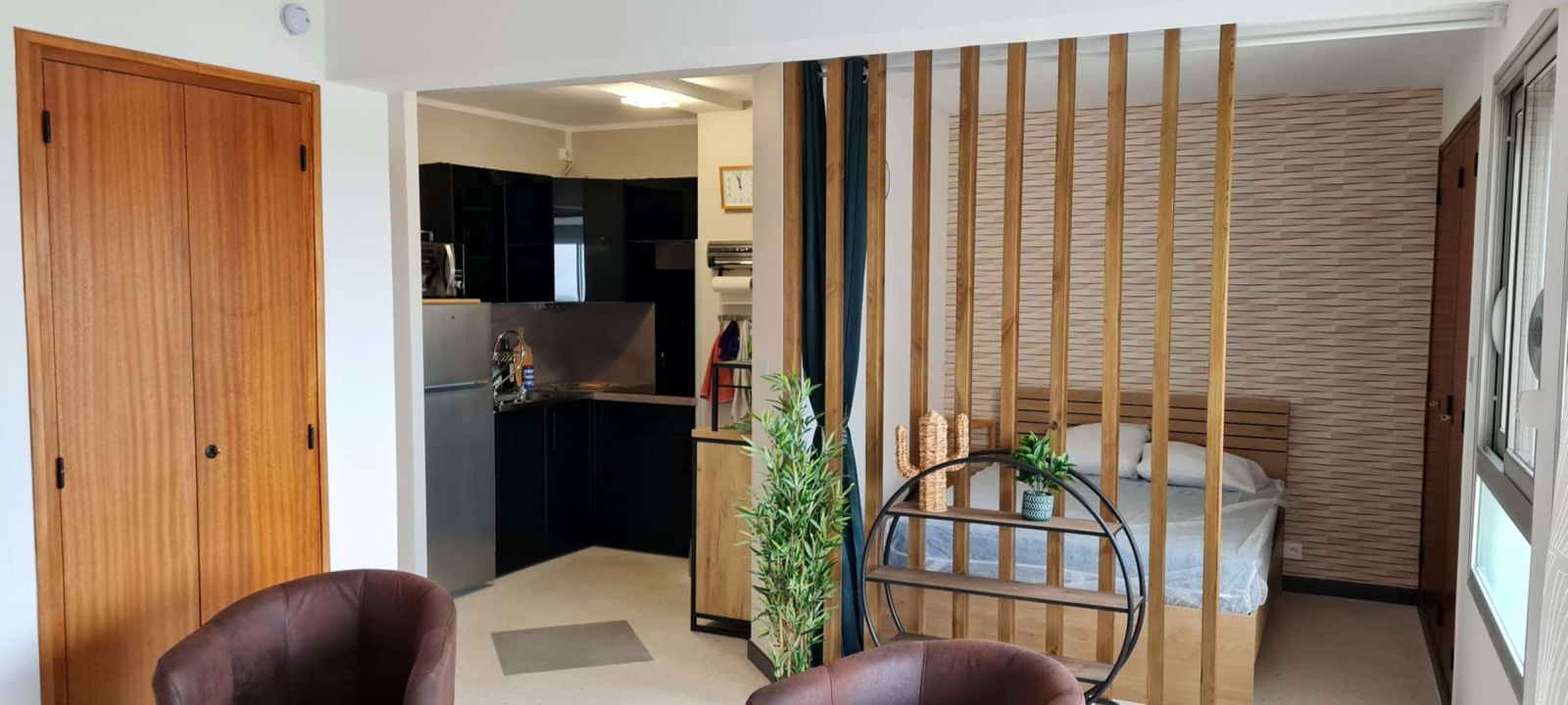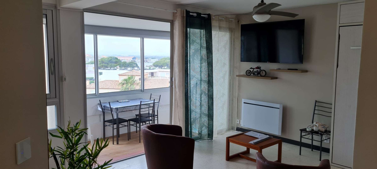 Grand studio d’environ 25 m2, aménagement fonctionnel : séjour/salle à manger avec canapé convertible 2 couchages (140), TV. Cuisine ouverte (frigo congélateur, plaques de cuisson, micro-ondes). Une salle d’eau avec douche ainsi qu’un un lave-linge, WC séparés. Accès depuis le salon sur une loggia avec coin repas. Une place de parking privative.