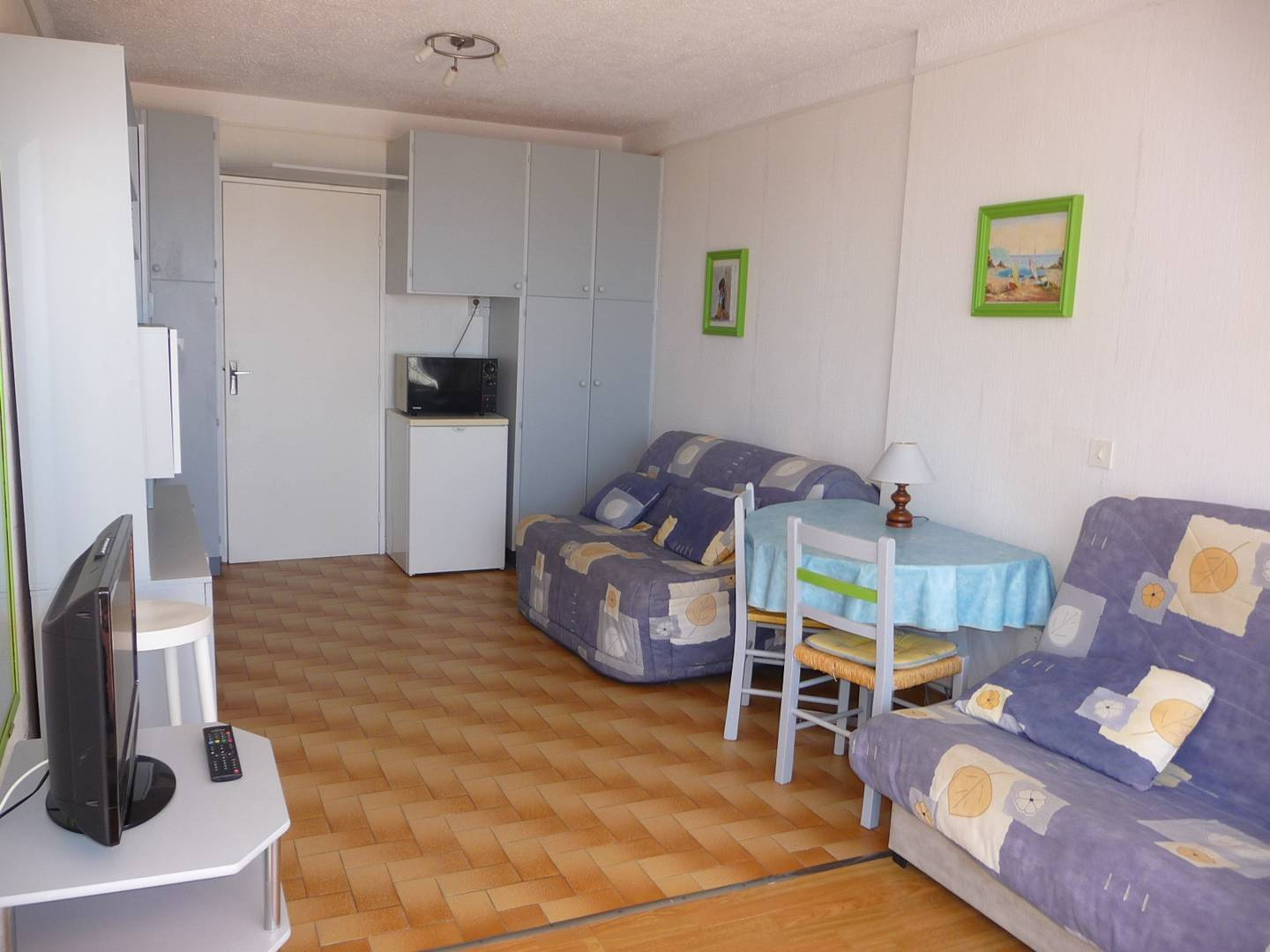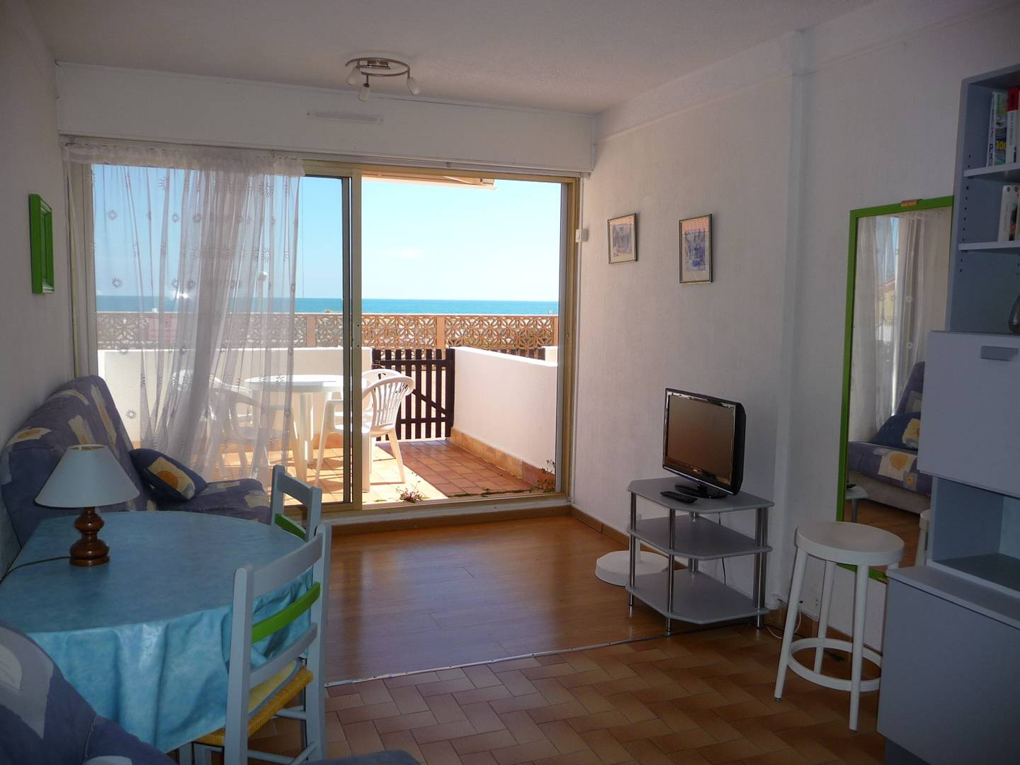 Studio cabine (23m²) en RDC, face à la mer, aménagement optimal et agréable: Séjour avec clic clac (couchage 2 personnes), et BZ en 140 (couchage 2 personnes), coin repas et TV. Le séjour offre une terrasse vue imprenable sur la mer. Coin cuisine équipé (plaques de cuisson, micro onde, frigo, lave linge). Une Salle d'eau avec WC. Le studio dispose d’une belle vue mer et accès direct à la plage. Equipé pour 4