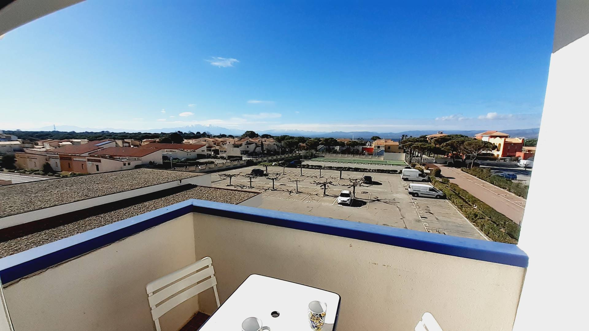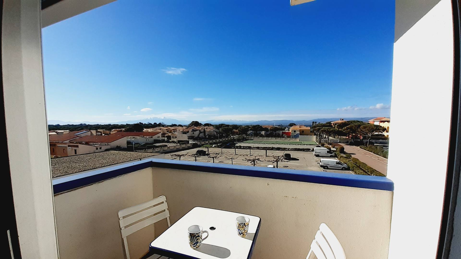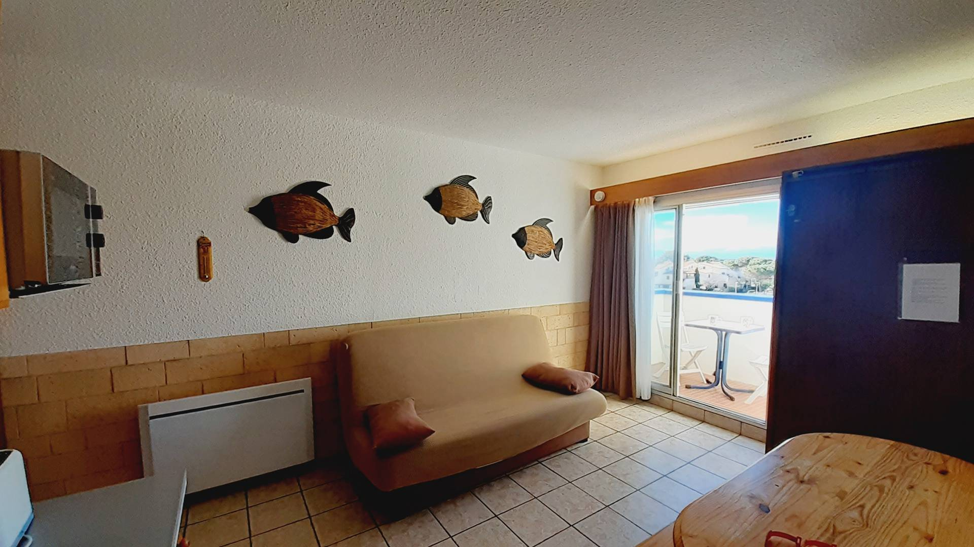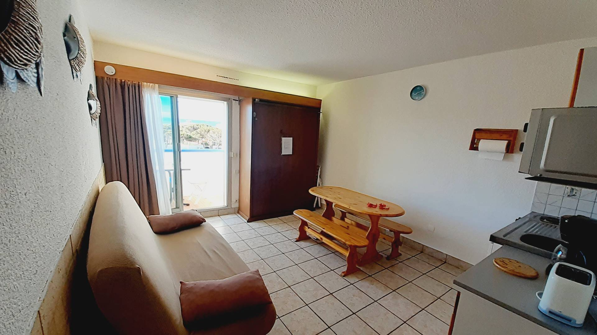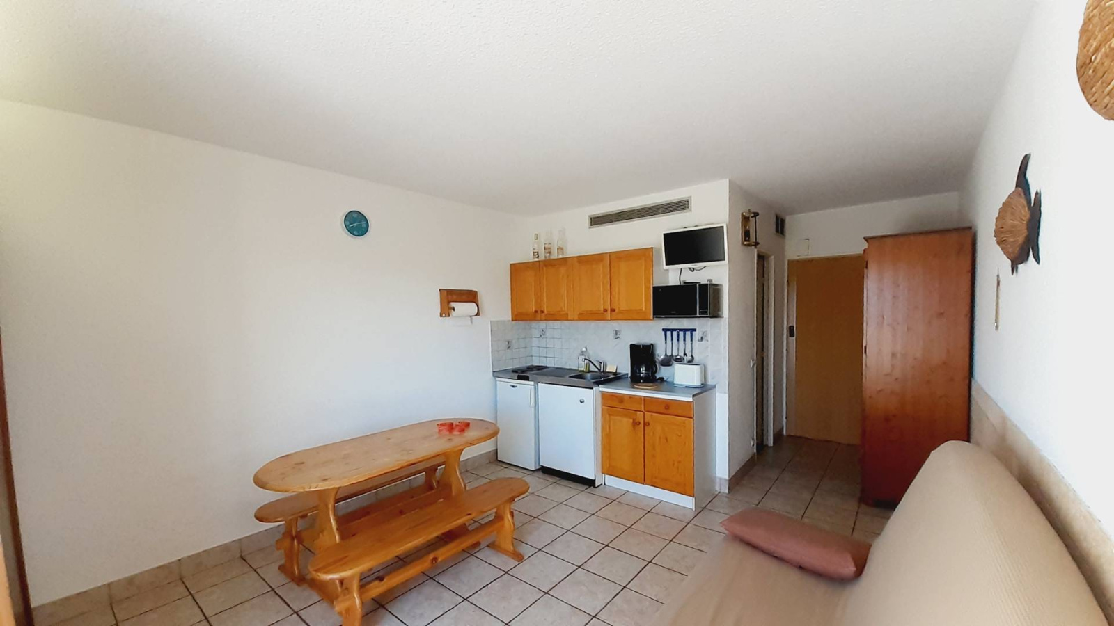 Au 2 E étage (ascenseur), Studio canine, ouvert sur Balcon comprenant un séjour avec un coin repas, TV et clic clac en 140 (couchage 2 personnes), coin cuisine équipée ( plaques, Micro onde, frigo top, lave linge). Coin cabine avec lits superposés en 90 (idéal couchages 2 enfants). Salle de bain avec WC. Balcon équipé exposée OUEST (coin repas avec table et chaises) et piscine (15 juin-15 septembre). Equipé pour 4 personnes.