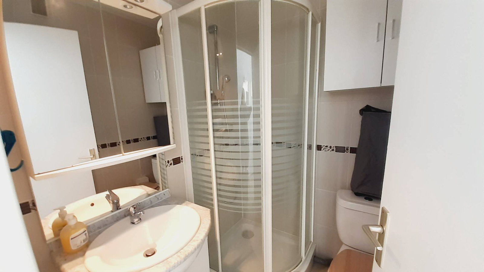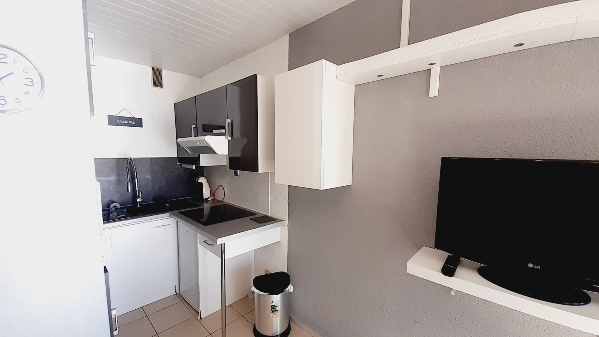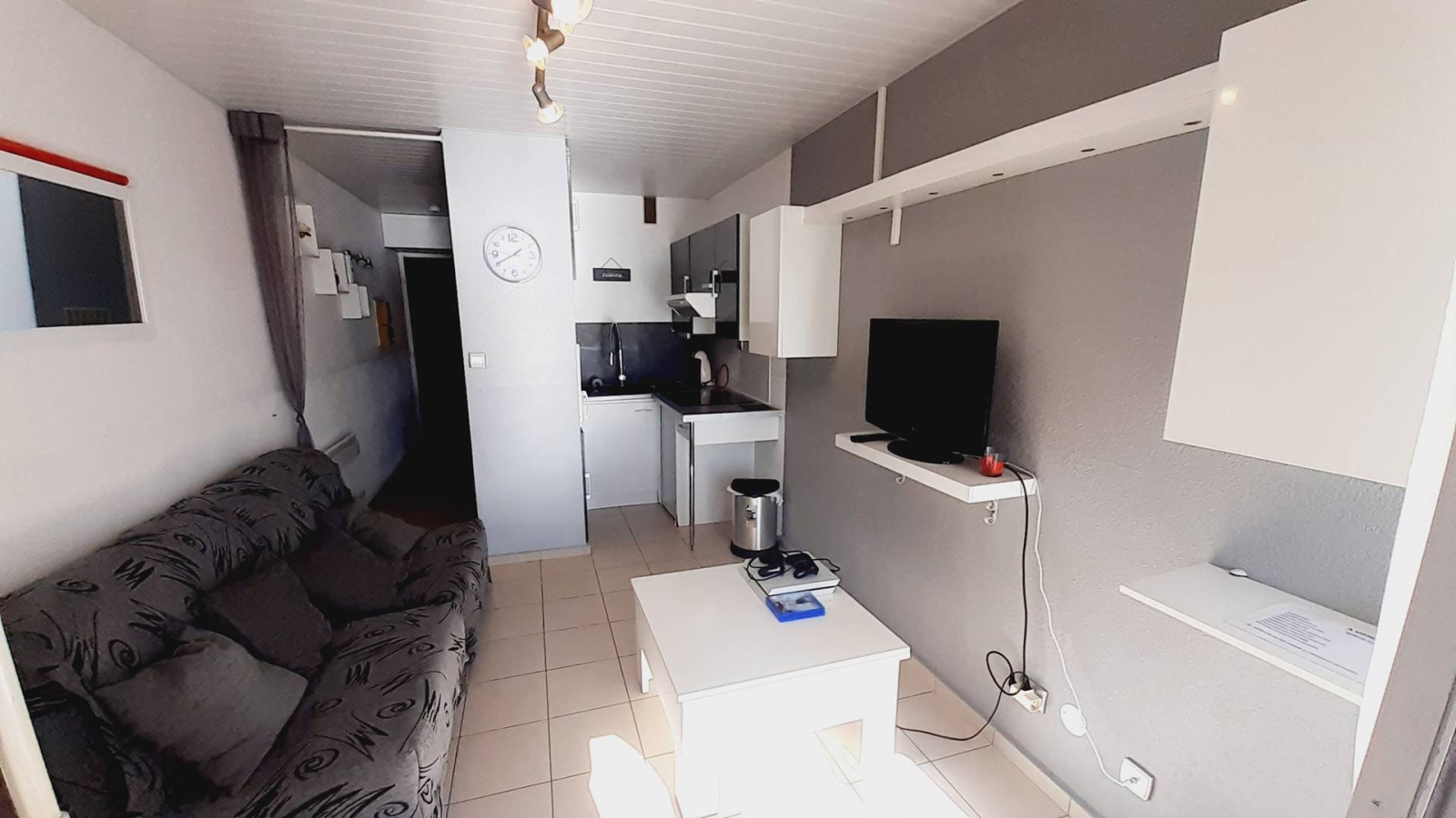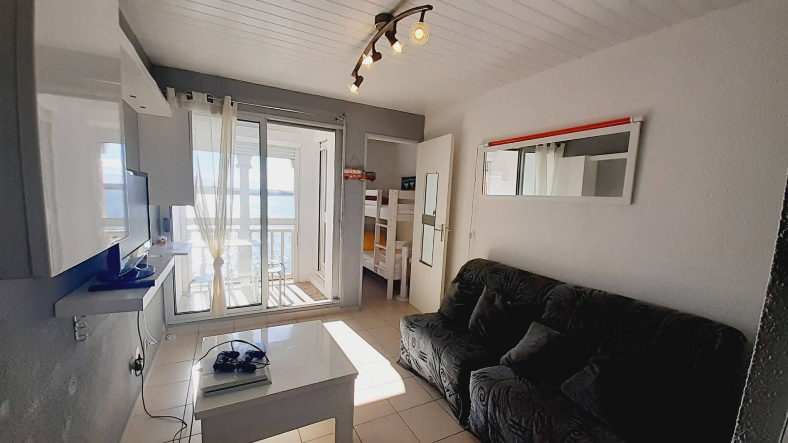 Au 2 ème étage Studio Cabine traversant d’environ 22 m2 entièrement rénové, aménagement agréable : séjour avec deux BZ en 80 (couchage 2 personnes) et TV. Cuisine ouverte (plaques de cuisson, micro-onde, frigo top, congélateur,). loggia avec table et 4 tabourets équipée pour vos repas avec Vus sur le lac marin et la piscine. Une cabine avec deux lits superposés en 90 (couchage 2 personnes). Salle d’eau (cabine de douche) et WC. Belle vue sur le Lac marin et la piscine, EXPO SUD.