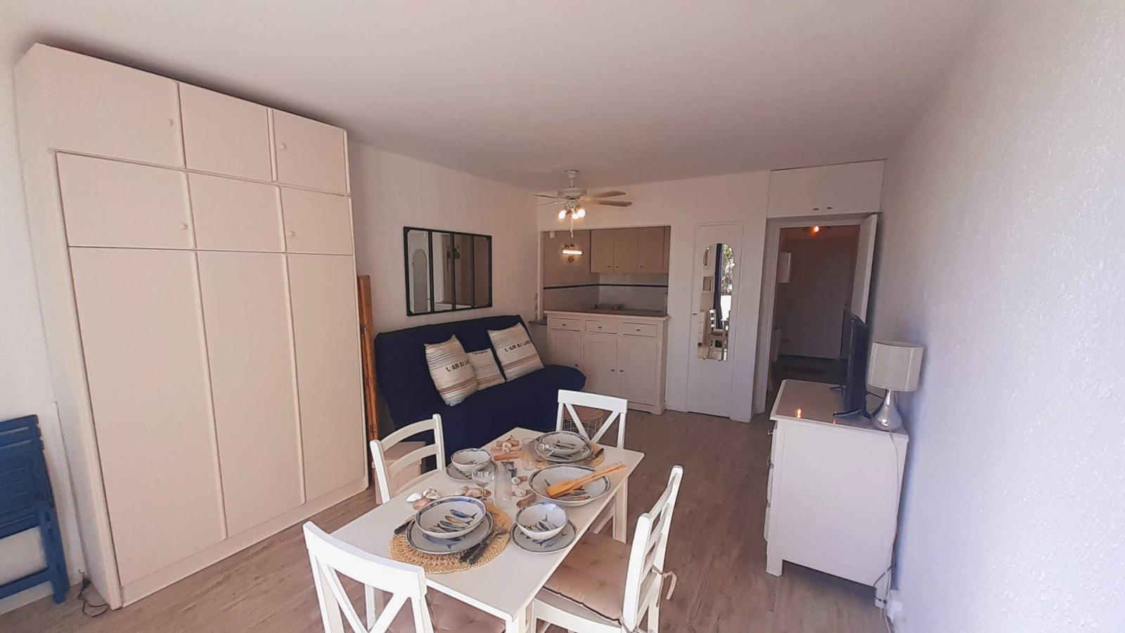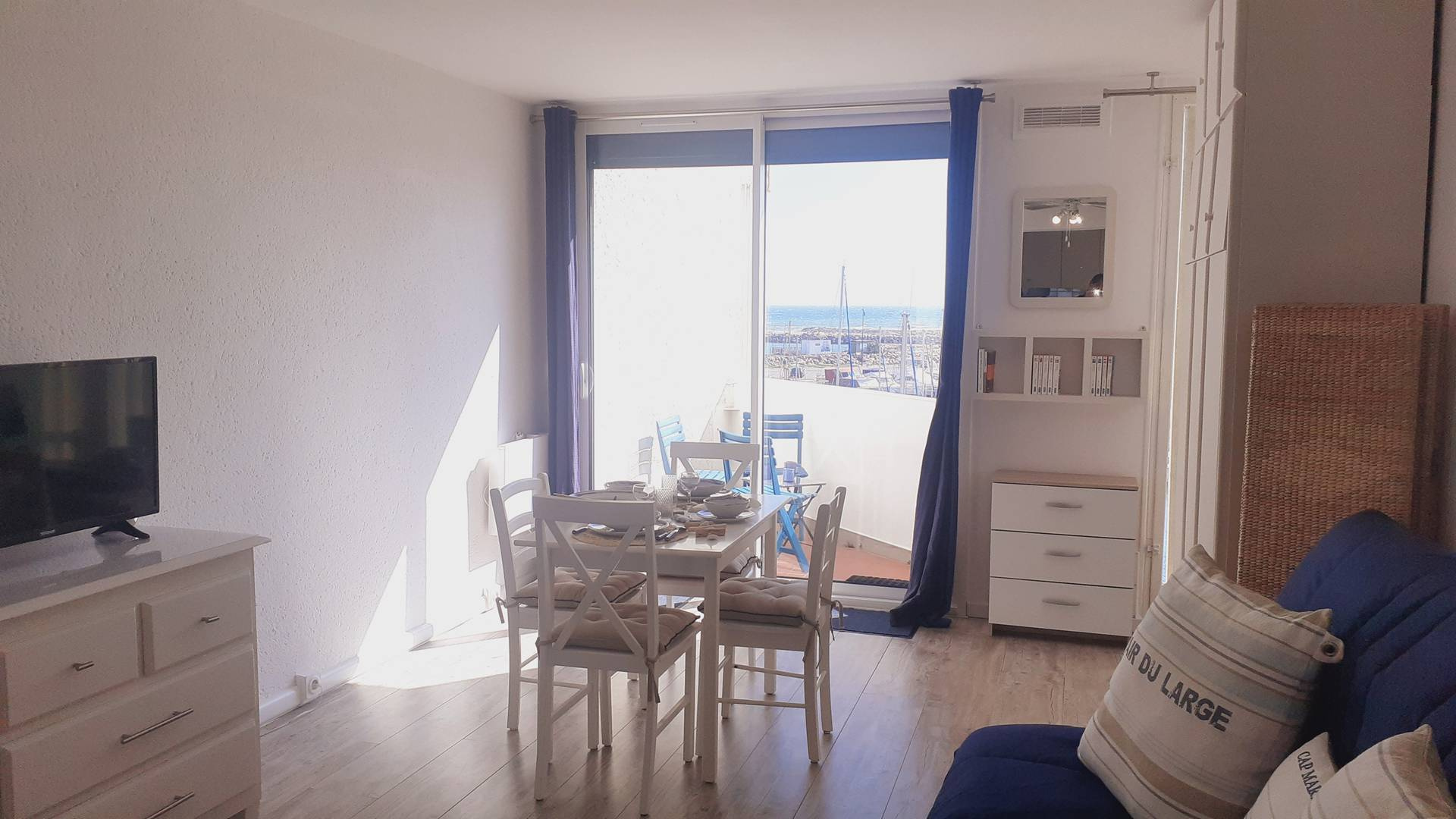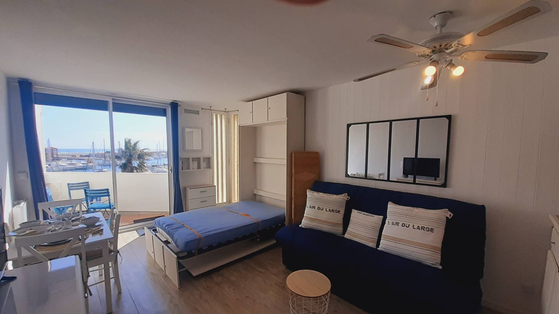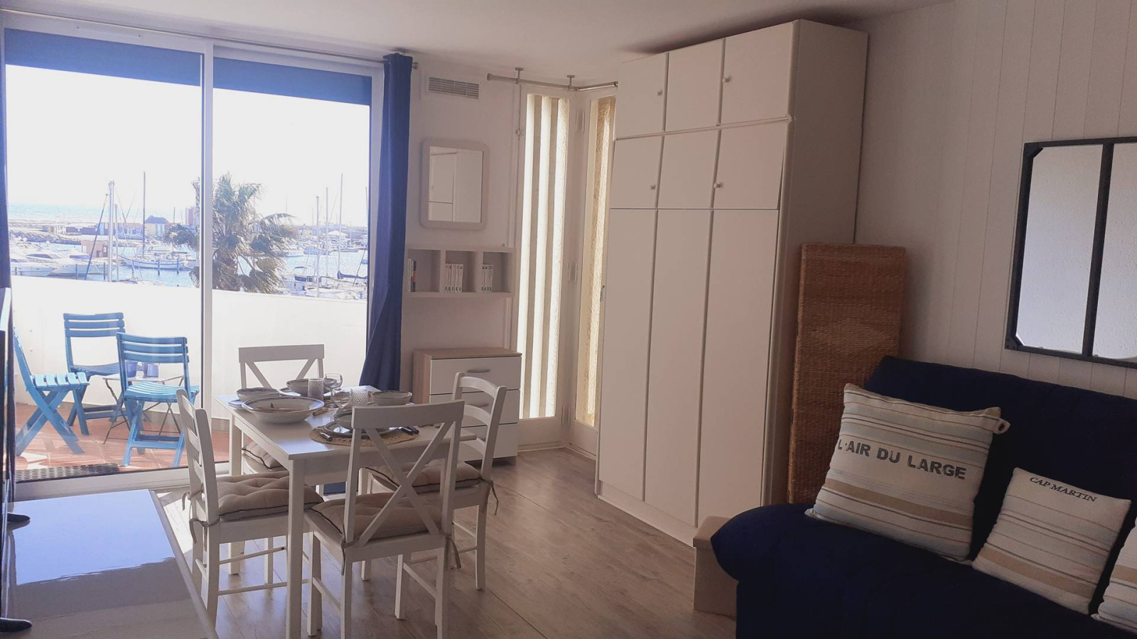 Magnifique Grand Studio (32m²) entièrement rénové face au Port de Plaisance et la Mer, confortable et agréable : Entrée donnant sur couloir desservant salle d’eau avec lave-linge, WC séparés, cuisine semi ouverte tout équipée (lave-vaisselle, plaque de cuisson 2 feux, micro-ondes, Frigo congélateur) et belle pièce de vie face à la mer et au Port. La pièce principale propose un canapé clic clac en 140 (couchage 2 personnes) et un lit pont (rabattable en 130) couchage 1 ou 2 personnes, TV, et un coin repas. Accès terrasse équipée pour vos repas. Les petit plus : Proche de la plage et des commerces. parking Public gratuit à proximité. Équipé pour 3/4 personnes. Logement NON FUMEURS / ANIMAUX NON ADMIS.